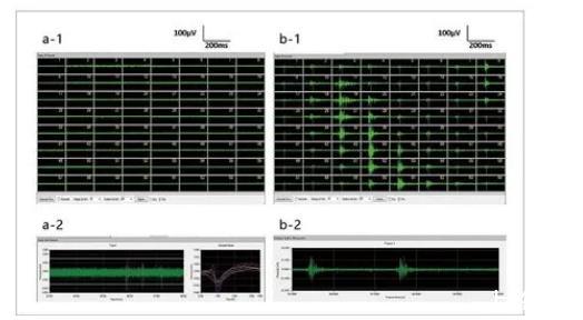 圖2.小鼠海馬腦片放電(a-1.MED64記錄正常小鼠海馬腦片自發(fā)放電;a-2.第29通道海馬腦片神經(jīng)元自發(fā)放電;b-1.MED64記錄4AP+無(wú)鎂高鉀ACSF誘導(dǎo)的海馬腦片自發(fā)性癲癇樣放電;b-2.第27通道海馬腦片神經(jīng)元癲癇樣放電)