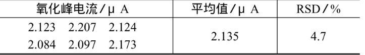 對2.5 mmol/L的AA標準工作溶液平行測定6次,氧化峰電流測定結果的相對標準偏差為4.7%,說明電極具有良好的重現性,試驗結果見表2。