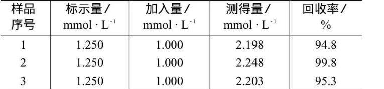 取5片維福佳維生素C含片(標含維生素C:100mg/片),研碎,稱取少量,用1 mol/L KCl溶解,定量稀釋,按測定方法測得維生素C含量的平均值為96.63 mg/片。然后用標準加入法進行回收試驗,結果見表3。