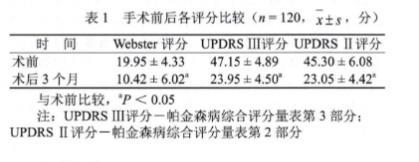 采用改良Webster評分法評價治療效果,肢體的震顫、僵直完全消失為顯效;癥狀明顯緩解,但仍殘留部分癥狀為有效;癥狀無改善為無效。