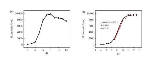 由于pH對所有生命體而言都至關(guān)重要,因此精確監(jiān)測pH的變化至關(guān)重要。目前,已開發(fā)出多種技術(shù)手段用于測定pH值,例如PH微電極、核磁共振、吸收光譜等方法。其中,熒光光譜法由于靈敏度高、信噪比高、響應(yīng)速度快、成本低、操作簡單和實(shí)時(shí)監(jiān)測等優(yōu)點(diǎn)被廣泛應(yīng)用于化學(xué)生物傳感領(lǐng)域。然而,大多數(shù)pH熒光探針都是基于有機(jī)小分子熒光團(tuán)設(shè)計(jì)合成的,存在光穩(wěn)定性差、生物相容性差、毒性高、制備過程復(fù)雜等缺點(diǎn),限制了其在生物體系中的廣泛應(yīng)用。因此,開發(fā)用于監(jiān)測生理環(huán)境中pH變化的新型熒光探針對于研究受pH影響的相關(guān)的疾病具有重要意義。