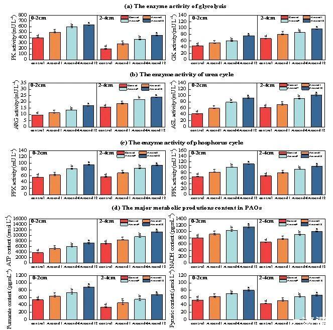 圖4培養80天后死亡藻類沉積對0-2厘米沉積物PAOs代謝中糖酵解(a)、尿素循環(b)、和磷循環(c)過程關鍵酶活性和主要代謝產物含量(d)的影響。