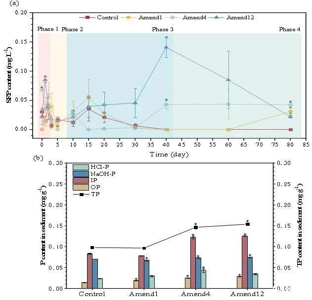 圖3對照組、Amend1組、Amend4組和Amend12組在80天培養期間上覆水中SRP濃度的連續變化(a),以及對照組、Amend1組、Amend4組和Amend12組在培養結束時0-2厘米沉積物中不同P組分(OP、IP、HCl-P、NaOH-P、TP)的連續變化(b)。