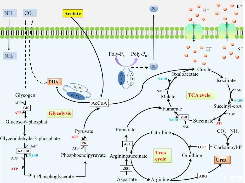 圖5 PAOs在P循環過程中典型微生物葡萄糖代謝(糖酵解和TCA循環)和尿素循環示意圖