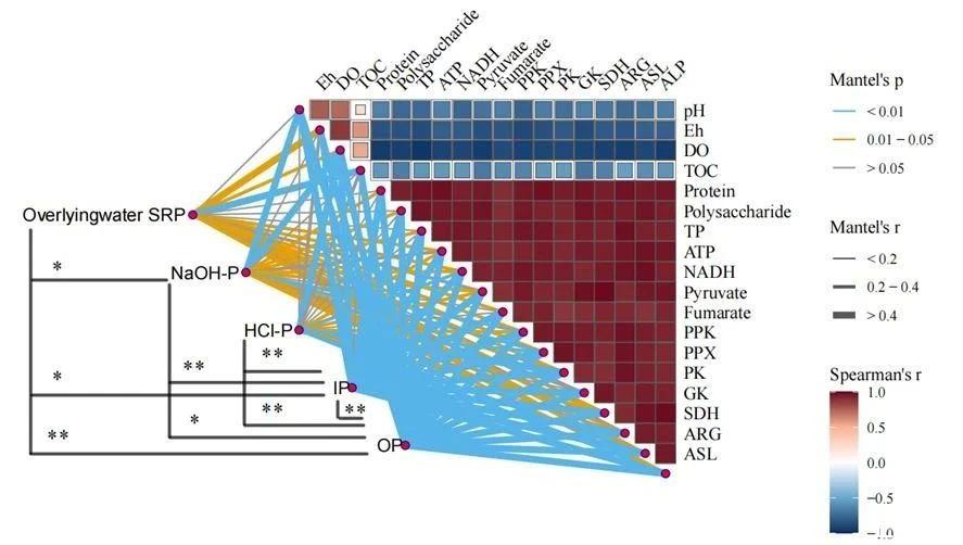 相關熱圖顯示了死亡藻類沉積后不同物理、化學和生物因子之間的相關性,左側的線條代表了水體和沉積物中的各種磷組分與沉積物的物理、化學和生物因子之間相關性的大小和顯著性。