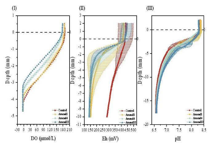 圖2對照組、Amend1組、Amend4組和Amend12組水沉積物界面(SWI)處溶解氧(Ⅰ)、Eh(Ⅱ)和pH(Ⅲ)的微觀分布圖。虛線代表SWI。