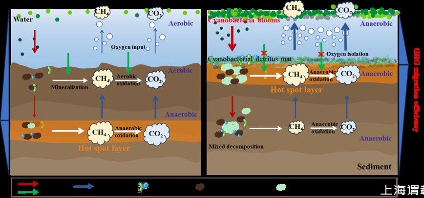 圖1藍藻衰亡改變富營養化湖泊沉積物中CH4和CO2產生熱區的概念圖