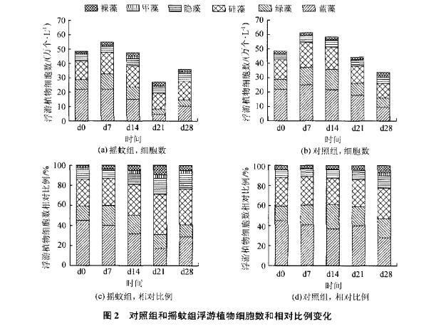 搖蚊組和對照組浮游植物種類組成變化如圖2。