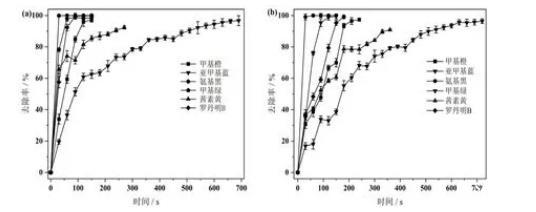 圖1(a)釕銥電極和(b)BDD電極對各種染料的去除效果圖