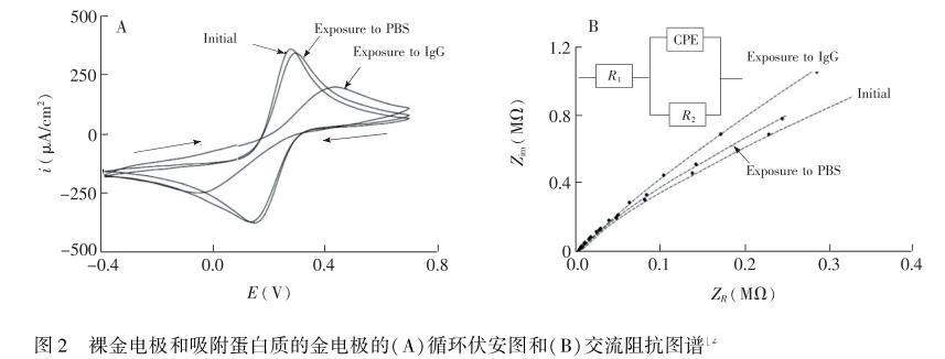 在電化學傳感器的研究中,不僅需要研究蛋白質在電極表面的非特異性吸附,最重要的是研究蛋白質吸附對電極電化學性能的影響。一般認為吸附在電極表面的蛋白質層是一個惰性的、非電化學活性的阻礙層,會影響電極的電化學性能,如法拉第電流、雙電層電容(Cd1)、電極阻抗,從而影響電極對待測物的電化學檢測結果,而且,這種影響隨著電極表面蛋白質的覆蓋率增大而加劇,影響最大的是電極的法拉第電流。因在任何情況下,電極表面發生蛋白質的非特異性吸附時,電極表面和電解質之間的電子(電荷)轉移速率都會受到嚴重阻礙,探針(或待測物)擴散到電極表面發生氧化還原反應也會被阻礙或完全阻止。