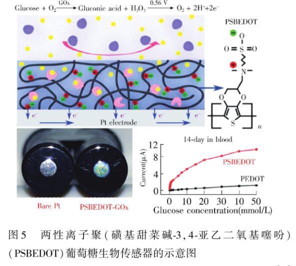 受這些天然膜分子抗蛋白質吸附性能的啟發,研究者合成了多種兩性離子聚合物,如SB、CB,或其類似結構的材料,其中SB和CB已被廣泛用于各種抗蛋白質吸附表面的修飾。Wu等使用一步電聚合法制備了基于兩性離子聚(磺基甜菜堿鄄3,4鄄亞乙二氧基噻吩)(PSBEDOT)鄄葡萄糖氧化酶(GOx)的葡萄糖傳感器。結果表明,該兩性離子膜具有優異的抗纖維蛋白原和血漿蛋白質吸附的性能(圖5)。Hu等采用電化學介導的原子轉移自由基聚合,在酶電極表面聚合兩性離子磺基甜菜堿甲基丙烯酸酯單體,在未稀釋的牛血清中浸泡15 d后,該電極減少了超過99%蛋白質的非特異性吸附,并且其靈敏度在15 d后仍保持在94%以上,而裸電極的靈敏度僅保留了約5%。Sun等報道了一種通過仿生甜菜堿化合物用于檢測蛋白質的抗蛋白質非特異性吸附的微陣列電極。微陣列電極通過豐富的羧基和兩性離子聚合物修飾,有效捕獲抗體,防止了其它蛋白質的非特異性吸附。