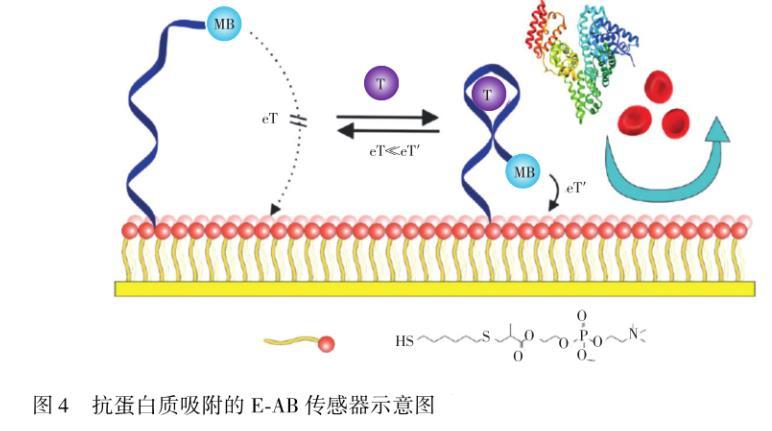 目前,兩性離子抗蛋白質材料可分為3種類型:磷酸膽堿(PC),磺基甜菜堿(SB)和羧基甜菜堿(CB)。這些兩性離子聚合物具有良好的穩定性和低成本等優點,有望替代目前商品化使用最多的PEG,應用于電化學生物傳感器和可植入性電極中?;赑C或者PC衍生物的自組裝膜均表現出優異的抗蛋白質吸附的性能和良好的電化學穩定性,其性能優于基于苯基PEG的自組裝膜(SAM)。Goda等通過邁克爾型加成反應,將2鄄甲基丙烯酰氧基乙基磷酸膽堿(MPC)連接到鏈烷二硫醇中的一個巰基,得到一個自組裝單層PC膜,該膜表現出優異的抗蛋白質吸附性能。Li等用磷脂酰膽堿(PC)自組裝單層膜構筑了電化學適配體生物傳感器。PC自組裝膜中PC鏈比較短,不僅可能保證傳感器的電子轉移,而且能夠有效阻止蛋白質或細胞在電極表面上的非特異性吸附,從而提高了傳感器在全血中的分析性能。在流動體系中,檢測全血12 h后基線漂移僅為10%,而未使用PC構筑的傳感器降低了70%(圖4)。