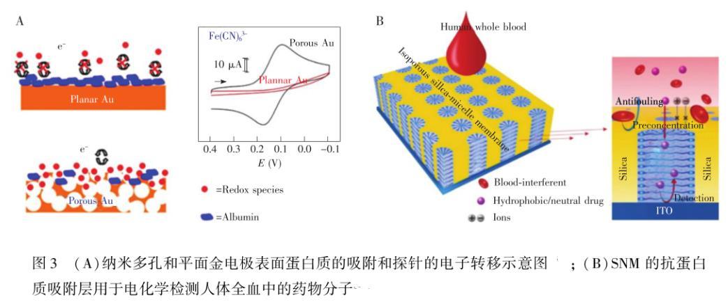 Sun等制備了孔道內含有表面活性劑的超薄等孔徑二氧化硅膜(SNM),將其應用于電化學傳感器的抗蛋白質吸附。該電化學傳感器可直接檢測全血(無需預處理)中的藥物,并表現出優異的抗蛋白質吸附能力。這主要是由于:(1)直徑約2.3 nm的超小型通道的尺寸篩分能力,它只允許小的親脂性/中性待測物滲透到SNM中并富集,隨后被電極檢測到;而大的、帶電的和親水性物質不能通過孔道到達電極表面;(2)高密度的、規則的、垂直排列的通道具有的高滲透性和低阻抗效應,保證了物質的傳遞和電子轉移(圖3B)。
