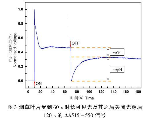 圖3中顯示了光照60 s并在光源關(guān)閉后記錄之后的120 s煙草葉片的ΔA515-550信號(hào),此信號(hào)特征與先前Schreiber等測(cè)量的信號(hào)以及Johnson等測(cè)量的信號(hào)完全符合。此信號(hào)的特征為:光源開啟后的ΔA515-550信號(hào)迅速達(dá)到峰值,隨后在接下來的30 s內(nèi),信號(hào)衰減到峰值的50%左右。然后信號(hào)緩慢地提升至60 s左右達(dá)到穩(wěn)態(tài)。當(dāng)關(guān)閉光源時(shí),ΔA515-550信號(hào)迅速下降至最低點(diǎn),然后緩慢上升直至達(dá)到另一個(gè)穩(wěn)態(tài)。