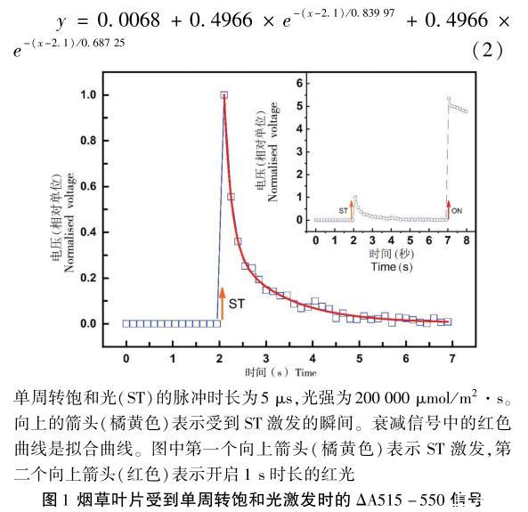 圖1為煙草葉片首先受到ST的激發(fā),5 s過后,再受到1 s的紅光照射的ΔA515-550曲線,光強(qiáng)為1024μmol/m2·s。單周轉(zhuǎn)飽和光的激發(fā)使ΔA515-550信號(hào)迅速上升,然后以雙指數(shù)型在大約3 s內(nèi)衰減至0。通過曲線擬合,可以得到兩個(gè)指數(shù)加和形式的衰減方程為: