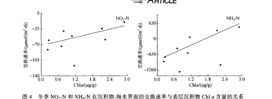 從圖4可以看出,在冬季,隨著表層沉積物中Chl的增多,沉積物-海水界面NO2-N和NH4-N的釋放速率基本呈增大趨勢。結(jié)合相關(guān)分析(表5)可知,隨著表層沉積物中Chl含量的升高,沉積物中C/N呈降低趨勢,這可能是因為沉積物中Chl含量越高,海洋內(nèi)源有機質(zhì)含量越高,有機質(zhì)的活性越強,沉積物中有機氮更容易被礦化生成NH4-N并向上層水體擴散,因此底層NH4-N交換速率呈上升趨勢。隨著表層沉積物Chl含量的增加,冬季底層NO2-N的交換速率也呈增大的趨勢,考慮到NH4-N和NO2-N分別是硝化作用的底物和中間產(chǎn)物,因此冬季NO2-N的交換速率可能主要受硝化作用調(diào)控。