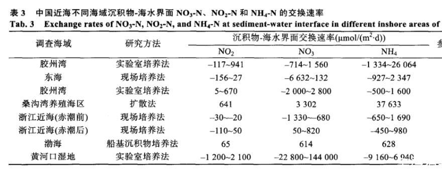 表3中國近海不同海域沉積物-海水界面NO3-N、NO2-N和NH4-N的交換速率