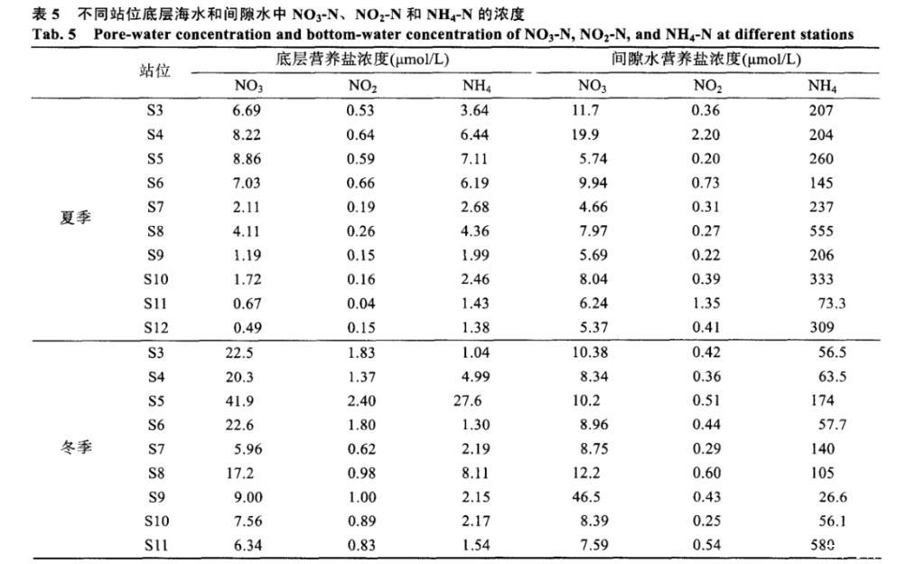 表5不同站位底層海水和間隙水中NO3-N、NO2-N和NH4-N的濃度