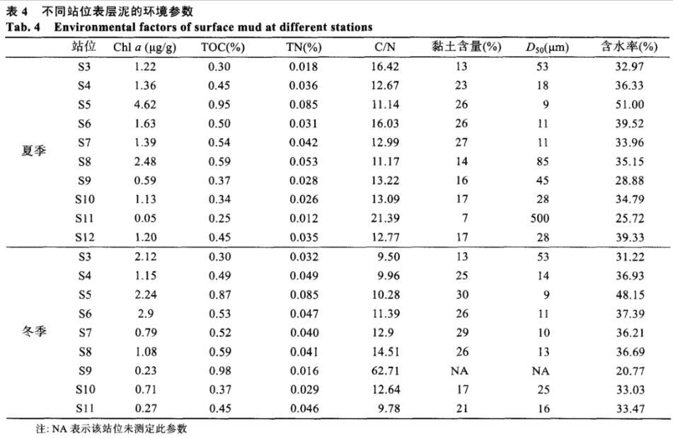 表4、表5列出了不同站位的底層環(huán)境參數(shù),從表4中可以看出,表層沉積物的Chl為0.05~4.62μg/g,TOC在0.25%~0.95%,TN含量為0.012%~0.085%,C/N為9.50~62.71,黏土含量為7%~30%,50為9~500μm,含水率為20.77%~51.00%,底層海水的NO3-N、NO2-N和NH4-N濃度分別為0.49~41.9μmol/L、0.04~2.40μmol/L和1.04~27.6μmol/L,間隙水中NO3-N、NO2-N和NH4-N的濃度分別為4.66~46.5μmol/L、0.20~2.20μmol/L和26.6~580μmol/L。