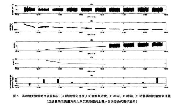 圖5渦動相關數據時序變化特征:(A)海流垂向速度;(B)溶解氧濃度;(C)水深;(D)水溫;(E)計算得到的溶解氧通量(正通量表示通量方向為從沉積物指向上覆水)(誤差條代表標準差)