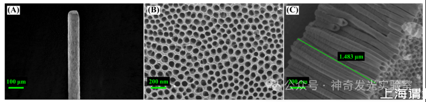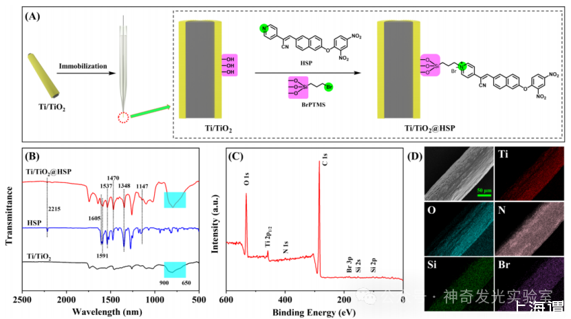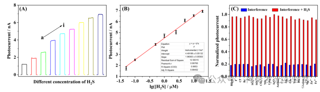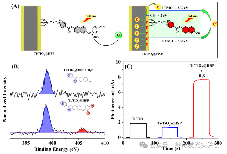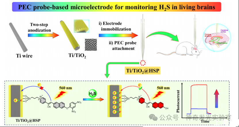 湖南科技大學陳述教授團隊開發了一種基于Ti/TiO2(鈦絲/TiO2納米管陣列)底物和有機PEC探針的PEC微電極,用于體內H2S的定量測定。利用有機探針實現了對目標的特異性識別和光響應。有機PEC探針具有明確的結構,可以合理設計為包含選擇性反應基團,其結構和光物理性質易于調整,使其在PEC傳感器中應用有效。通過控制鈦絲的陽極氧化,得到Ti/TiO2的微電極基底,原位生成二氧化鈦納米管。在構建Ti/TiO2 HSP光電電極的過程中,將H2S特異性識別探針(HSP)共價結合到二氧化鈦表面。這種結構模擬了染料敏化太陽能電池電極的典型配置,其中納米結構的二氧化鈦提供了一個大的表面積,有利于與有機染料的大量結合,而二氧化鈦作為一個有效的光電子集電器,為強光電流響應提供了基礎。