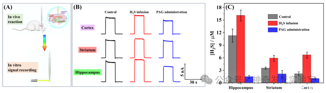 該體系中,微電極上的探針HSP可以與H2S特異性反應,促進2,4-二硝基苯(DNP)醚基序的裂解,形成具有典型D-π-A光活性分子結構的光敏劑,從而顯著提高光電流響應。這種PEC微電極對硫化氫表現出快速、特異性的反應,并能在生理pH條件下的水緩沖液和人工腦脊液中對H2S表現出有效的反應。隨后,我們使用PEC微電極檢測了正常活小鼠大腦不同區域(海馬、紋狀體、大腦皮層)的H2S水平,并驗證了硫化氫在藥理調節作用下的腦H2S水平的變化。所有的體內實驗結果都表明,該傳感器能有效地檢測活腦中的H2S。因此,本研究不僅為體內精確定量的H2S提供了有效的工具,也為其他重要生物分子PEC傳感器的開發提供了參考范例。