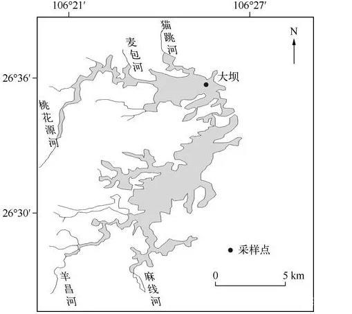 紅楓湖(26°31′——26°34′N,106°24′——106°43′E)位于清鎮市、平壩縣和安順市西秀區境內,是貴州省1958年開始在貓跳河干流上筑壩興建的一座高原人工河道水庫,于1960年5月建成蓄水。紅楓湖流域面積1596km2,正常水位海拔1240m時湖泊水面面積57.2km2.湖泊長16km,平均寬4km,最大水深45m,平均水深10.5m,總庫容6.01×108m3.紅楓湖是目前貴州省中部最大的人工水庫,兼具發電、防洪、旅游、工農業用水、飲用水源、水上運動、調節生態環境等多種功能,其主要入湖河流包括羊昌河、貓跳河、麻線河以及桃花源河等。選取大壩前深水區(水深25——30m)作為代表性研究點位(圖1)。