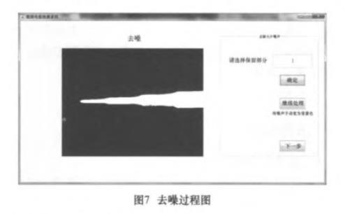 在經過上述處理之后,大部分電極圖片的噪聲都被去除,可以進行輪廓提取工作,但少部分圖片的背景中依然存在大片噪聲。使用bwlabel函數標注圖像中的連通域,再用regionprops函數計算出各連通域的周長,系統檢測整幅圖片后在各個連通域的中間以紅色標號。處理好后,操作者在GUI中選擇需要保留的電極部分,系統就會自動刪除剩余的噪聲部分(圖7)。經過噪聲處理,電極圖像的處理工作全部完成,系統可提取電極輪廓。