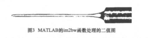 閾值的選取決定了二值化處理的效果,是后續一系列圖像處理的基礎。在MATLAB中有專門的二值化處理函數im2bw,它將在未設定閾值時自動選擇一閾值進行二值化。但應用到圖像中的效果如圖3所示。