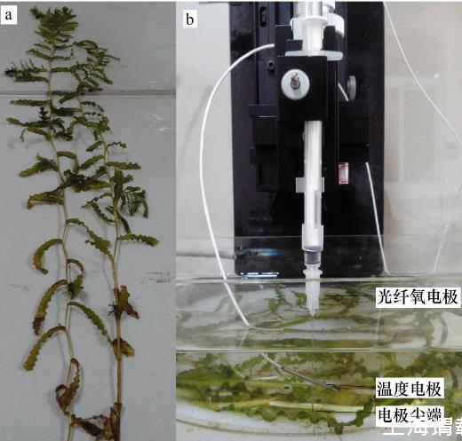 在菹草穩定期,采集完整成熟菹草3株,用原位水置于方形玻璃缸中在溫室內馴化培養3d后測定(圖1b)。選擇晴朗天氣(2013年4月26日6:00—27日早6:00)江蘇省生態修復平臺玻璃溫室中進行,借助顯微鏡和電極信號,找到葉片表面,10min自動記錄一次數據,連續測定24h。測定O2和溫度的同時,采用ZDR—14型照度記錄儀同步記錄光強。2013年4月26日6:00—27日6:00,溫度最高30℃,最低13℃,據國家授時中心網站(http://time.kepu.net.cn/)查詢得監測時段日出、日中、日落時刻。4月26日日出時刻為05:24,日中時刻為12:03,日落時刻為18:42,4月27日日出時刻為05:23,日中時刻為12:03,日落時刻為18:42。故將26日6:00—18:42及27日05:23—6:00作為白晝。
