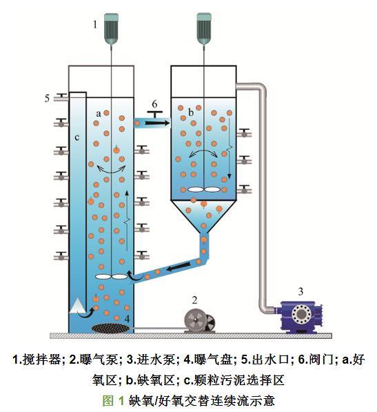 本研究采用的是由非曝氣池和曝氣池串聯組成的缺氧/好氧交替連續流反應器,反應器均由有機玻璃制成,其中曝氣池由好氧區和顆粒污泥選擇區組成,非曝氣池由缺氧區組成。為保留生物質,本研究采用系統內部形成的水力剪切力(機械攪拌及曝氣)完成缺/好氧區的交替過程從而代替蠕動泵壓破顆粒的不利影響,其中回流比通過控制閥門開關來計算。顆粒污泥選擇區為在好氧區內置的顆粒污泥選擇裝置,其特殊構造使其更好進行泥水分離防止氣泡進入選擇區內,然后使沉降的顆粒污泥返回好氧區,實現污泥的回收。內部選擇裝置由兩部分組成:①圓柱形的腔室,在外部有7個排污口,用于排放水和污泥。②在腔室的底部有2個對稱的三角形交換孔和1個特殊的擋板,利于顆粒的沉淀。