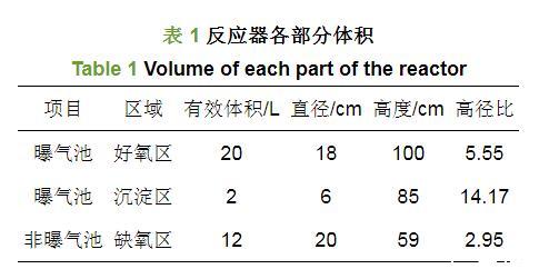 首先生活污水由水泵進入缺氧反應區(圖1中b區),然后經過缺氧攪拌的生物反應后,帶有顆粒污泥的廢水流入好氧反應區(圖1中a區)。在顆粒污泥選擇區(圖1中c區)中,沉淀性能較好的顆粒污泥在沒有水泵提供任何壓力的情況下會自動回落到好氧區(圖1中a區),實驗裝置如圖1所示,各部分體積如表1所示。反應器具體運行參數見表2.