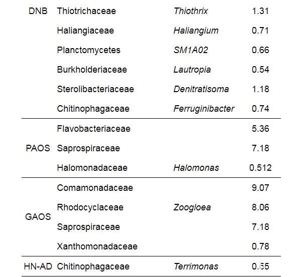 分別將所得的微生物種群在科級和屬級歸類為不同的微生物功能菌群,分析了連續流脫氮除磷系統的微生物群落結構。分類結果如表6所示,功能菌群有氨化細菌、氨氧化菌(AOB)、亞硝酸鹽氧化菌(NOB)、反硝化菌(DNB)、異養硝化~好氧反硝化細菌(HN-AD)、聚磷菌(PAOs)和聚糖菌(GAOs)。
