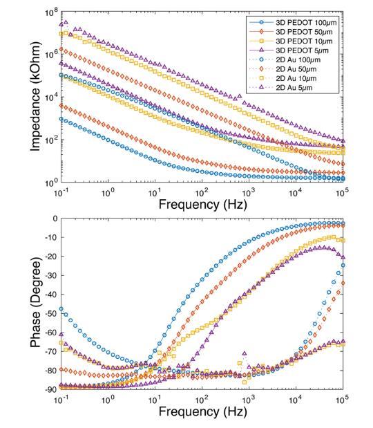 圖4.對四種不同足跡尺寸的3D PEDOT:PSS涂覆微電極和2D金微電極進行電化學阻抗譜(EIS)測量。