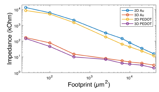 圖3.1kHz下八個不同足跡面積的的平均阻抗,以展示3D結構和多孔PEDOT:PSS涂層的改進(n=8)。