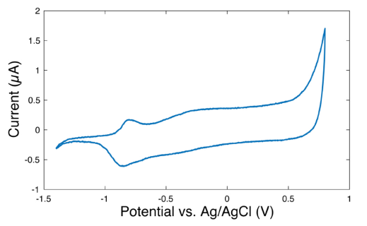 圖5.在生理鹽水中,對邊長為200微米的PEDOT:PSS涂覆3D電極進行循環(huán)伏安法測量,掃描速率為100 mV/s。
