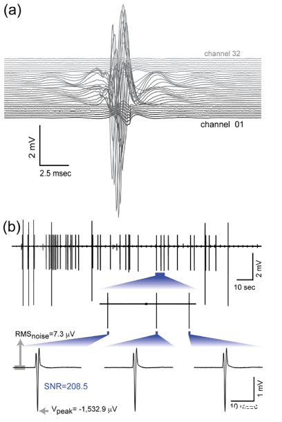 圖6.高分辨率肌電圖記錄與微錐MEA。(a)從小鼠二腹肌記錄的單個運動單位示例。在這里,大約有電極陣列32個通道的一半檢測到了單個動作電位。(b)從單個MEA通道記錄的多個運動單位。頂部,在二腹肌上記錄的一個時期,兩個不同的運動單位同時被記錄,它們可以通過不同的幅度在視覺上區(qū)分。底部,三個單個尖峰及其相應信噪比值的細節(jié)。