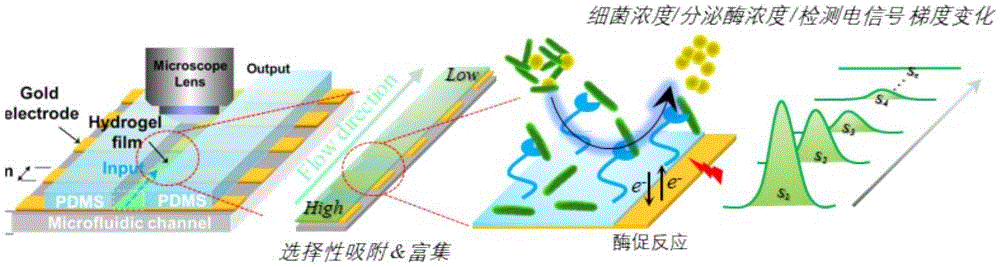 優選的,所述高通量電化學梯度擴散快速檢測細菌微流控裝置進行細菌的電化學梯度傳感和快速檢測的具體方法為:將細菌樣品流入微流通道中進行梯度擴散0.5~10min,用于進行細菌的梯度擴散快速檢測;清洗后再通入濃度0.1%~8%的葡萄糖溶液,進行微電極陣列的電流信號檢測實現對細菌濃度檢測,同時通過電流的梯度變化率,對檢測結果進行矯正和驗證。