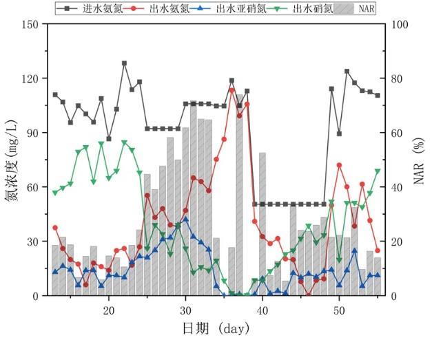圖2亞硝化反應(yīng)器第二階段運行濃度變化