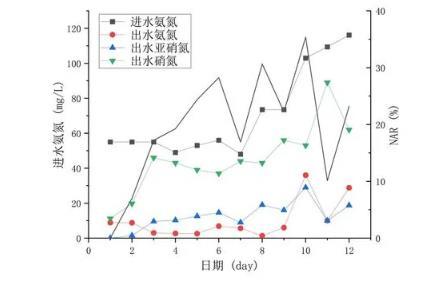 (1)反應(yīng)器啟動。亞硝化反應(yīng)器接種了實驗室培養(yǎng)成熟的硝化污泥后,向反應(yīng)器內(nèi)配置了50mg/L氨氮內(nèi)循環(huán)悶曝3天時間,出水硝氮迅速升高,表現(xiàn)出了良好的硝化活性(圖1),第4天開啟連續(xù)流進(jìn)水,通過提高進(jìn)水濃度與縮短停留時間的方法提高硝化負(fù)荷。第10天后,進(jìn)水固定為100mg/L,停留時間固定6h,系統(tǒng)的氨氮去除率也達(dá)到了90%,但NAR依然保持30%的范圍浮動,這也說明了,中低氨氮濃度進(jìn)水情況下普通的硝化反應(yīng)器無法實現(xiàn)亞硝化。