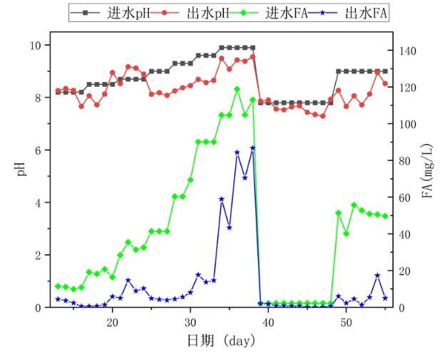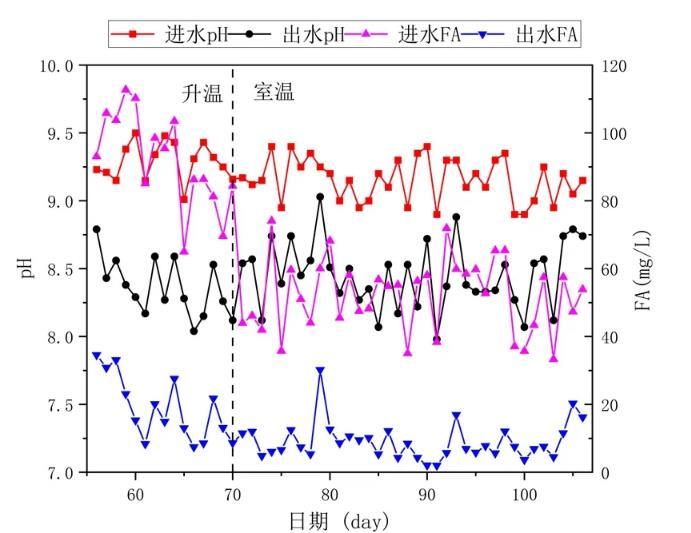 圖5升溫后亞硝化反應(yīng)器pH與FA濃度變化