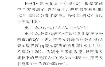 ΦS和ΦR分別代表Fe-CDs和參比溶液羅丹明6G的QY;n表示熒光發(fā)射峰的積分面積;A表示吸光度;η表示溶劑的折射率(水為1.33,乙醇為1.36)。為減小自吸收效應(yīng),限定激發(fā)波長(zhǎng)下的吸光度A<0.05(λex=488 nm,熒光發(fā)射范圍λem為500 nm~650 nm)。