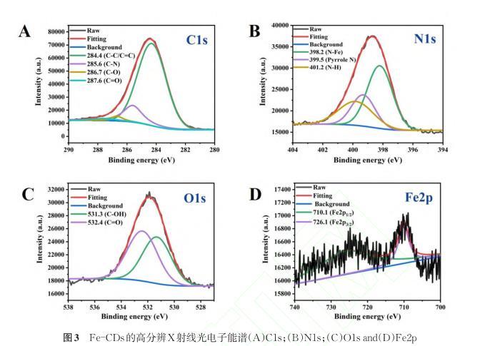 通過X射線光電子能譜(XPS)驗(yàn)證Fe-CDs中元素組成,如圖2(d)中出現(xiàn)四個(gè)特征結(jié)合能峰,分別位于285.6 eV、399.1 eV、532.0 eV和715.1 eV,表明Fe-CDs除H元素外還有C、N、O、Fe四種元素。高分辨率XPS譜顯示,C 1s是由284.4 eV(C-C/C=C),285.6 eV(C-N),286.7 eV(C-O)和287.6 eV(C=O)四個(gè)特征峰構(gòu)成的(圖3a)。N 1s譜中顯示了398.2 eV(N-Fe),399.5 eV(吡咯N)和401.2 eV(N-H)三個(gè)特征峰(圖3b)。由圖3C可以看出,O 1s譜是由531.3 eV(C-OH)和532.4 eV(C=O)兩個(gè)特征峰構(gòu)成的。Fe 2p譜中顯示了碳點(diǎn)中Fe的710.1 eV(Fe 2p1/2)和726.1 eV(Fe 2p3/2)兩個(gè)特征峰(圖3d)。XPS光譜結(jié)果與紅外光譜具有良好的一致性,進(jìn)一步證明了鐵元素的成功摻雜。