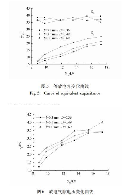 根據MDBD等效電路,利用等效電容方法,可得到C=C、C+C。=k C,進而獲得不同尺寸微腔結構電極在不同下的和c變化曲線,如圖5所示。從圖中可以看出,在電源頻率固定不變時,隨著的增高,C變化很小,其平均常數值近似為37pF;且在改變微腔尺寸時,C也基本在此值附近上下浮動;而C。隨著U的增高則不斷增大,且當。一定時,隨著微腔尺寸的改變,D相應的增大,C也不斷增大。