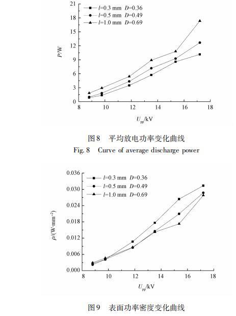 根據Lissajous圖形的面積和前面的分析,可以計算出平均放電功率P和微腔表面積的功率密度P,分別如圖8和圖9所示。MDBD受小曲率半徑微腔電極的影響,電場分布不均勻,易于發生電暈放電。從圖8中可以看出,隨著升高,電暈預電離的作用增強,放電通道傳輸的電荷量Q增多,平均放電功率P逐漸增大;且在f/一定時,隨著D增大,微腔電極與空氣接觸更充分,易于等離子體的形成與擴散,因此P也逐漸變大,二者成正比。從圖9中可以看出,因u升高,平均放電功率P增大,p均呈現增加的趨勢;但因MDBD發生在微腔內電介質表面,放電最先在電極附近開始,隨著升高,放電面積逐漸增大,向微腔中心發展,在微腔表面先達到飽和,并逐漸向外擴展,當微腔尺寸較小,即D較小時,易于達到飽和,故從圖9中可以看出在單個微腔中,D較小時,P較大。