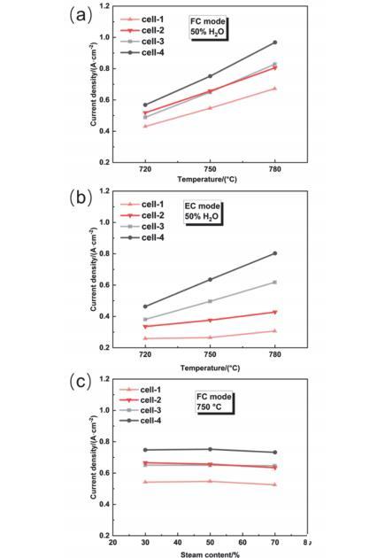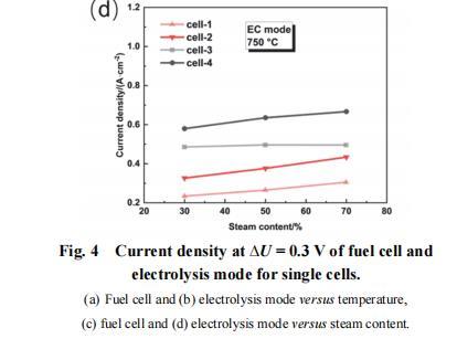 從圖3和圖4中可以看出,通過增大氫電極孔隙率可以顯著提升單電池性能,在750°C、50%H2O和0.3 V偏壓下,cell-1相比cell-3的SOFC發電電流密度從0.546 A?cm?2增大到0.649 A?cm?2,SOEC電解電流密度從0.263 A?cm?2增大到0.495 A?cm?2;采用致密薄膜GDC隔離層進一步降低了cell-4單電池歐姆阻抗,發電電流密度增加至0.752A?cm?2,電解電流密度增加到0.635 A?cm?2。結果表明,增大氫電極孔隙率及降低歐姆阻抗對于電解模式的性能提升明顯大于發電模式,在750°C、50%H2O和0.3 V偏壓下,cell-4相比cell-1的發電電流密度僅提升了~37%,而電解電流密度則提升了~140%。在其他溫度及水分壓等工況下,均具有相似的現象。