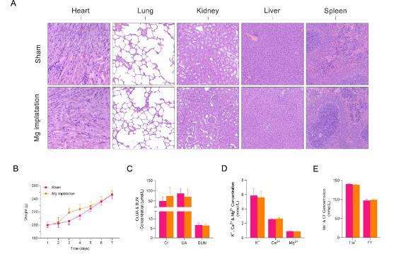 圖3、鎂片植入后的組織學發現和電解質維持。MI后7天從假手術組和鎂植入組大鼠采集的心臟、肺、腎臟、肝臟和脾臟的H&E染色(A)。鎂片植入后7天內大鼠體重變化(B)。血清Cr、BUN、UA、K+、Ca 2+、Mg 2+、Na+和Cl?鎂片植入后7天(C-E)。