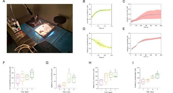 圖2、老鼠腔內的氫氣擴散到大鼠的器官中。(A)拍攝高分辨率照片記錄了在通氣支持下接受手術的麻醉大鼠器官中氫濃度的檢測過程。吸入4%氫氣(n=3)期間大鼠心臟中的氫氣濃度,特別是吸入氫氣開始時(B)和停止后(D)。鎂片植入后評估氣腔(C)和心臟(E)中的氫氣濃度(n=3)。鎂片植入后1、3、5和7天氣腔和肝、心、脾組織中的氫氣濃度(F-I)。