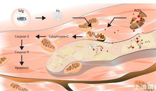 圖5、鎂片植入產生的氫氣及其對線粒體凋亡途徑的影響的示意圖。鎂片植入產生的氫氣可改善心肌梗死后大鼠的心臟氧化應激和細胞凋亡。