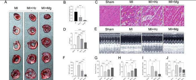 圖4、鎂片植入對大鼠心功能及心肌結構的影響。每組中具有代表性的TTC染色圖像和定量分析(A、B)。每組中具有代表性的H&E染色圖像。比例尺:50μm。箭頭表示炎癥細胞浸潤(C)。心臟損傷標記物cTnI的血清濃度(D)。從假手術、MI、MI+氫和MI+鎂組獲得的代表性M型超聲心動圖(E)。BNP濃度作為心力衰竭的血清生物標志物(F)。每組動物超聲心動圖測量的匯總數據,包括EF(G)、LVID(H)、ESV(I)和FS(J)。